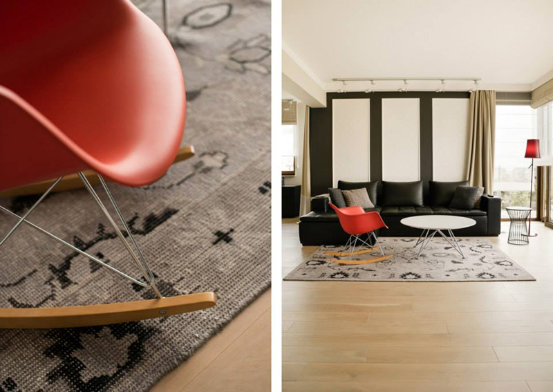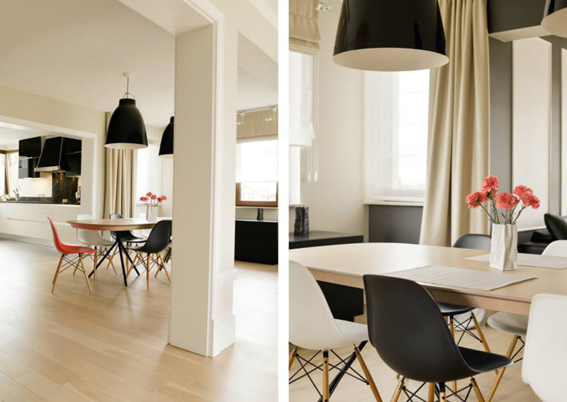 Hola, aquí os dejamos una propuesta de diseño de interiores realizada por la diseñadora polaca Lucyna Kolodziesjka realizado para el diseño moderno de un apartamento, donde utiliza principalmente elementos de mobiliario de diseño Eames.