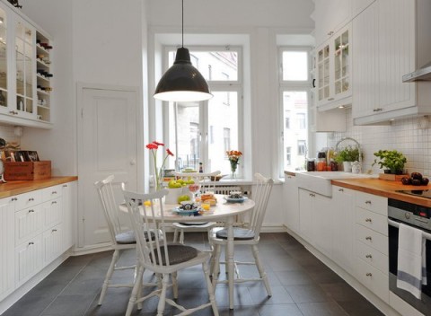La importancia de la luz en la decoración nórdica, ya que como sabéis para conseguir más luz en la cocina lo ideal es que pongamos colores claros, especialmente el blanco y para potenciar la luz natural colocaremos cortinas traslúcidas para que dejen pasar la misma. Ya que en los países escandinavos tienen pocas horas de luz y tienen que aprovecharlas.