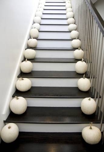 Si eres más del concepto minimalista, también puedes utilizar las calabazas para crear ambientes decorativos que inviten a celebrar Halloween, como en este caso, con las calabazas blancas, ubicadas ordenadamente en una escalera o en un pasillo.