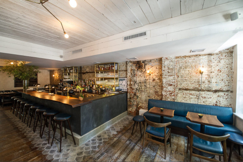 La barra con lámparas de sobremesa en latón, ladrillo viejo desnudo en las paredes, bellas bancadas de piel azul y vistas a un patio trasero donde el chef cosecha sus propias aromáticas para sus platos van a hacer sin duda de este nuevo espacio un referente para los asiduos a los locales más cool de la gran manzana.
