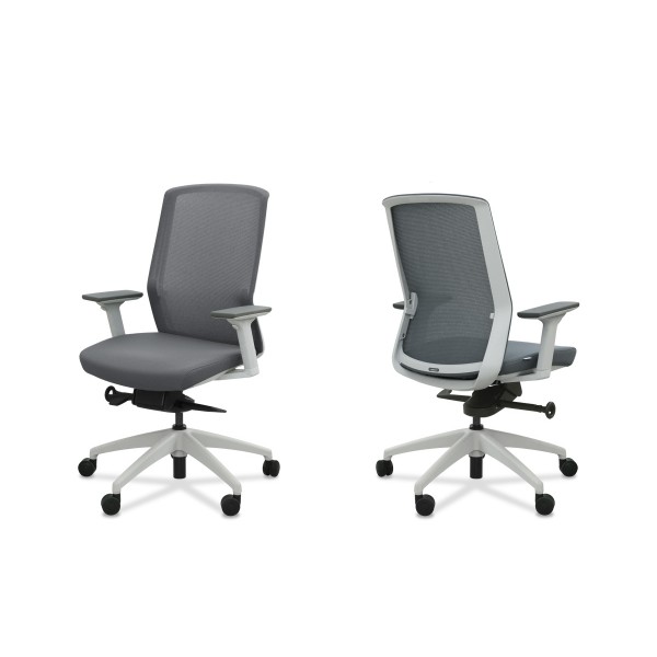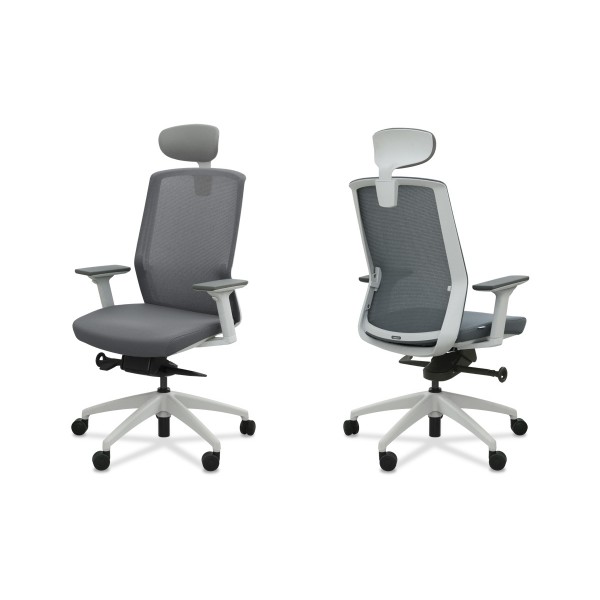Silla de oficina Zeus con estructura blanca, respaldo de malla y asiento tapizado, brazos regulables en altura, mecanismo basculante con paro en 6 posiciones, apoyo lumbar y base de 5 radios de nylon.