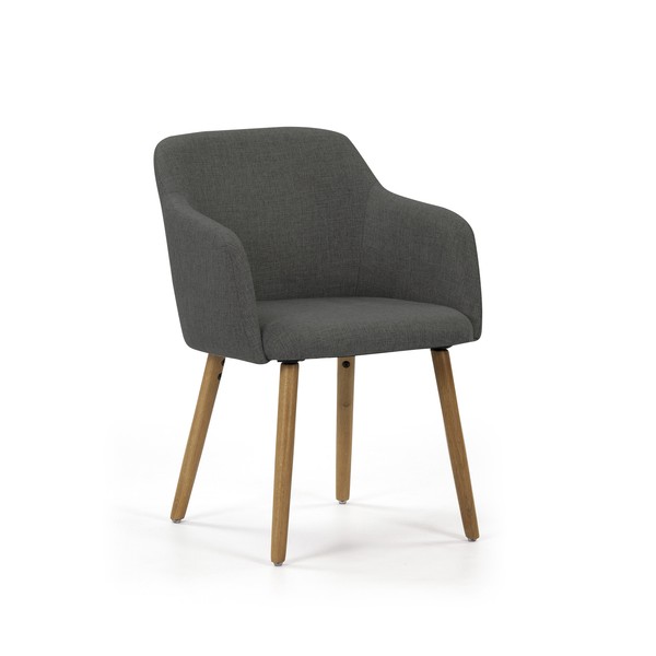El sillón de diseño Arles tapizado en tela de color gris verdoso con patas de madera de roble macizo, de estilo atempora y actual.Una pieza para tu comedor de gran confort.