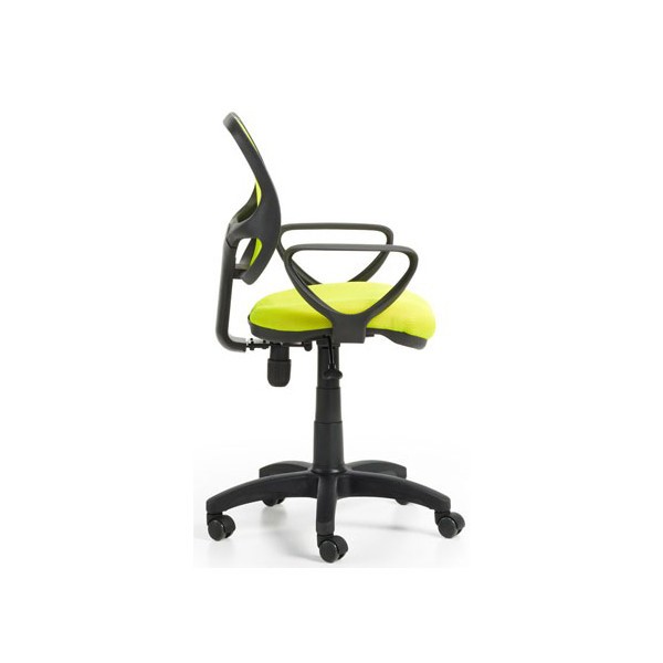 Silla de oficina con sistema de elevación graduable con pistón de gas, ruedas para parquet, respaldo acabado tejido Mesch transpirable.